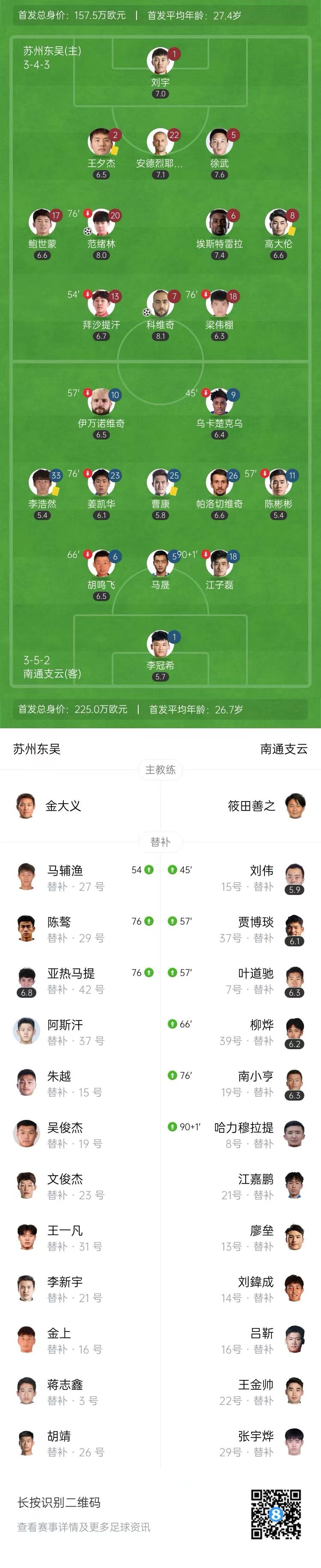 5月3日讯 北京时间5月3日19:00,中甲第7轮,苏州东吴坐镇主场苏州体育中心体育场迎战南通支云。上半场,范绪林任意球助攻拜沙提汗破门,科维奇补时阶段推射扩大比分。下半场,双方均未改写比分。最终,苏州东吴主场2-0击败南通支云,开赛7轮保持不败。