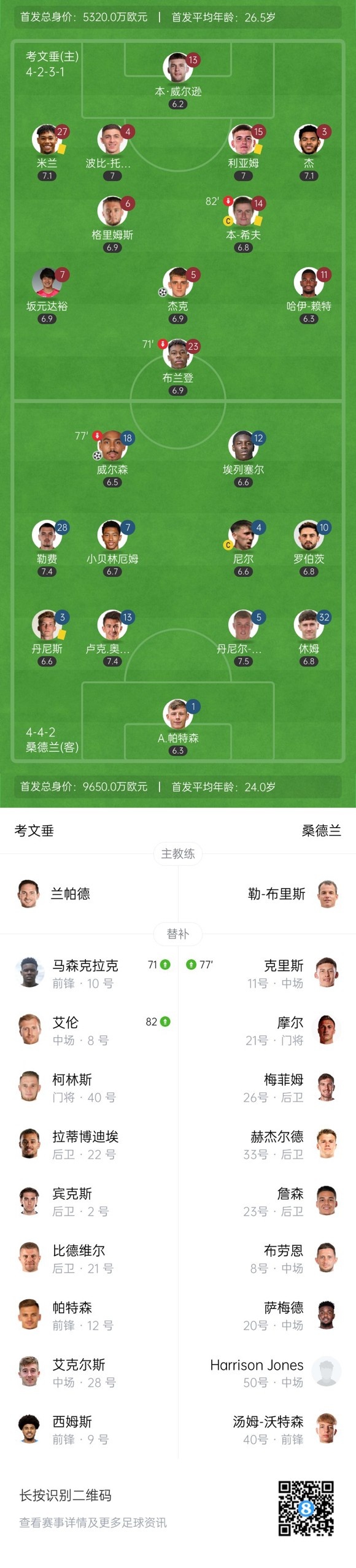 第69分钟,考文垂扳平比分!米兰右路下底传到禁区门前鲁多尼头球破门,考文垂1-1桑德兰。↓