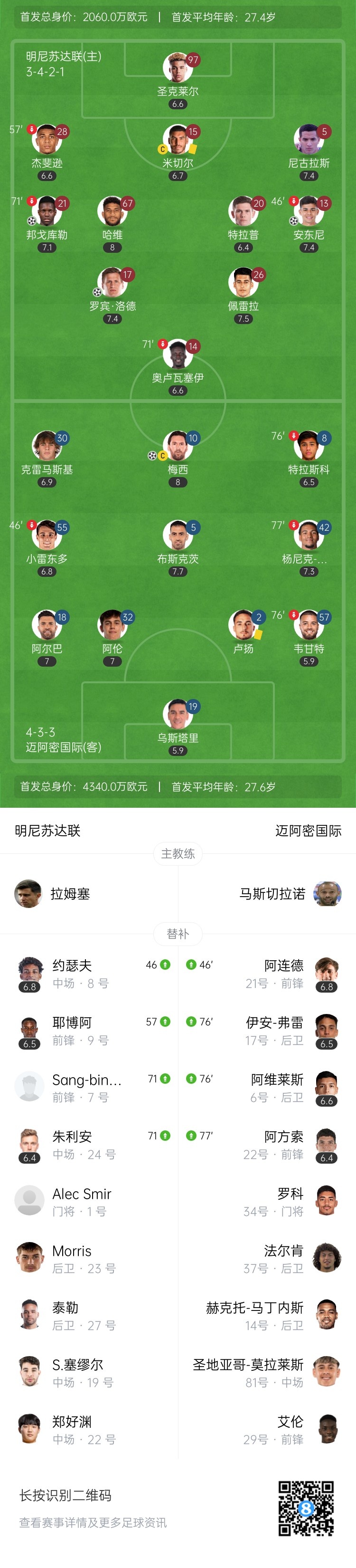 下半场补时3分钟。最终全场比赛结束,明尼苏达联4-1迈阿密国际。