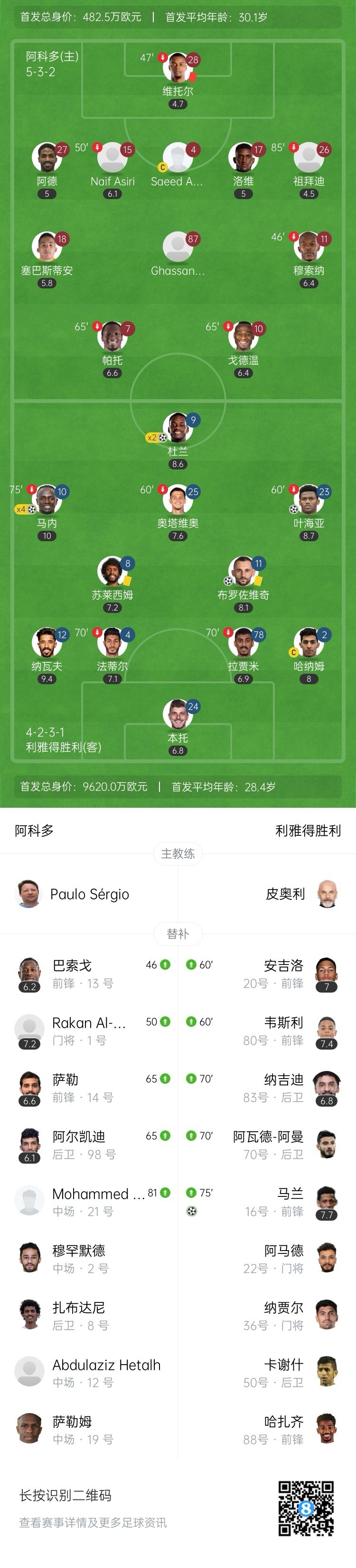 第50分钟,阿科多替补门将纳贾尔登场。↓