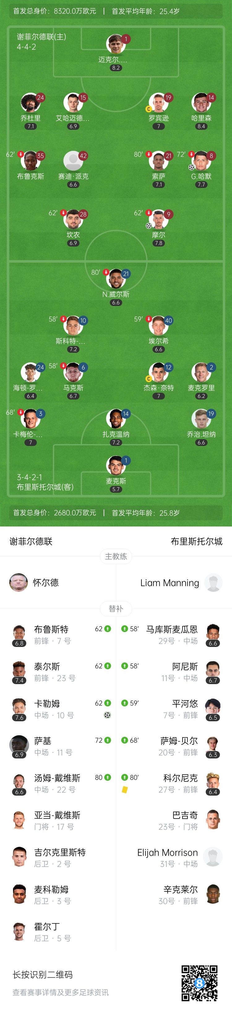 第83分钟,谢菲联左路直塞直接打穿!泰尔斯-坎贝尔左路传中,哈里森-布鲁斯故意一漏,卡勒姆-奥黑尔包抄破门!谢菲联3-0,总比分6-0布里斯托尔城↓