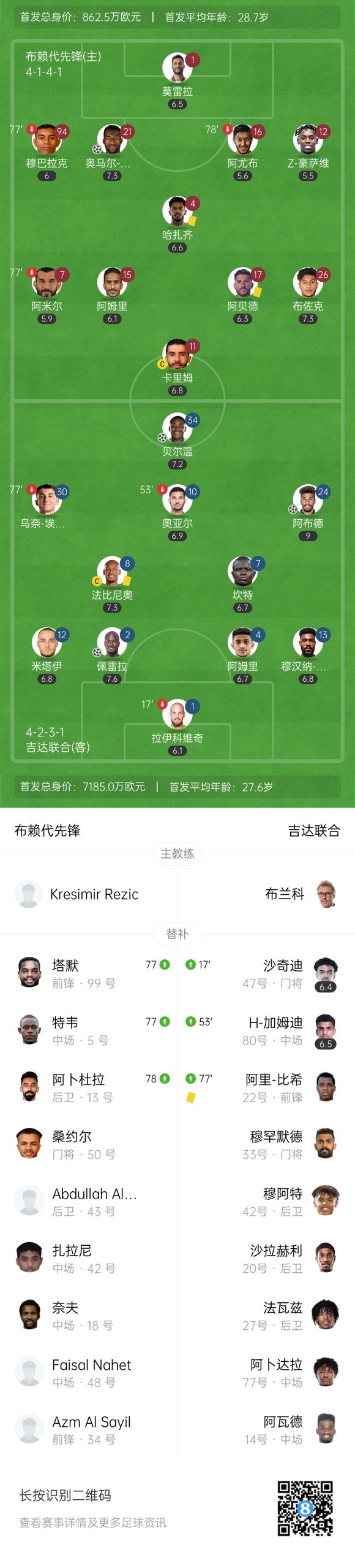 下半场补时5分钟,布赖代先锋1-3吉达联合。