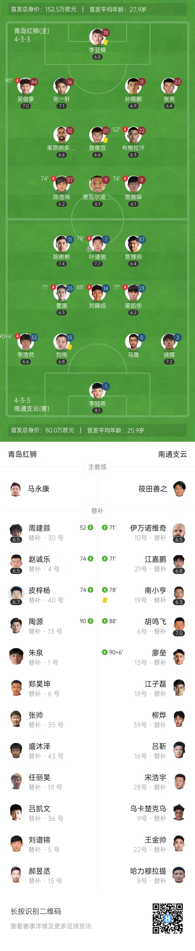 第65分钟,支云打出反击,陈彬彬左路送出精准助攻叶道驰打破僵局,南通支云1-0青岛红狮。↓
