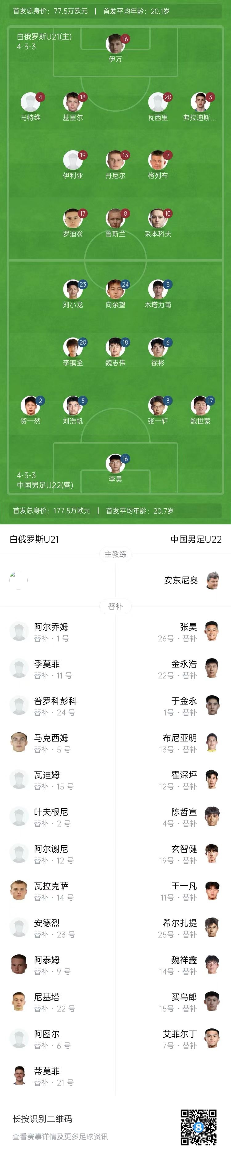 6月8日讯 北京时间6月8日0:00,足球友谊赛,中国男足U22做客迎战白俄罗斯U21。上半场,木塔力甫单刀击中立柱。下半场,刘小龙争议送点,巴拉诺克点球助白俄罗斯取得领先,木塔力甫角球头球扳平比分。全场比赛结束,中国男足U22做客1-1战平白俄罗斯U21。