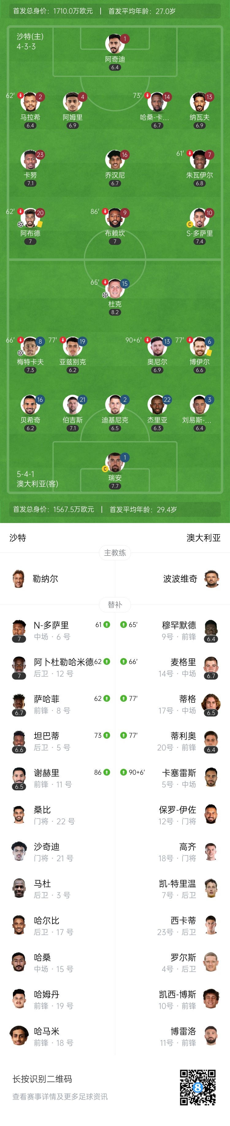 第85分钟,多萨里禁区附近倒地!VAR确认犯规地点在禁区内!点球!多萨里亲自主罚被马修-瑞安扑出!随后队友补射空门不进!沙特仍1-2落后澳大利亚↓