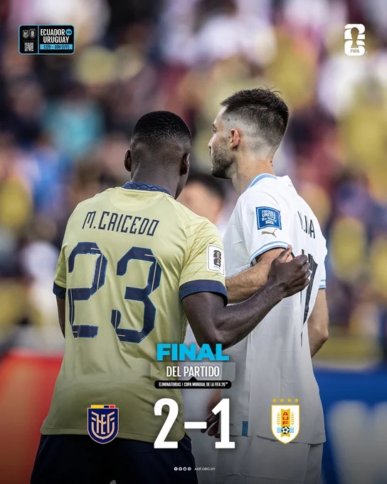 本场过后,乌拉圭2轮1胜1负,积3分暂列南美区世预赛第3。-3分起步的厄瓜多尔2场1胜1负,积分涨至0分,暂列第8。