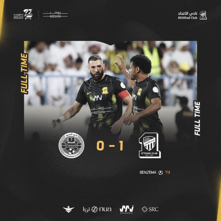 第72分钟,本泽马禁区内冷静处理,用膝盖将球撞进球门!1-0!吉达联合打破场上僵局!↓