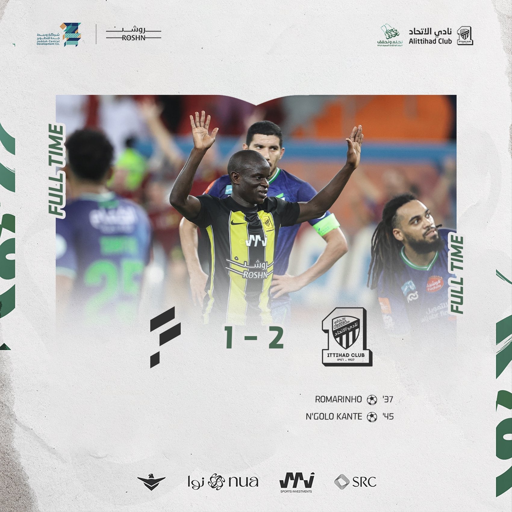 第38分钟,坎特一条龙后助攻,罗马里尼奥破门,吉达联合1-1扳平。↓