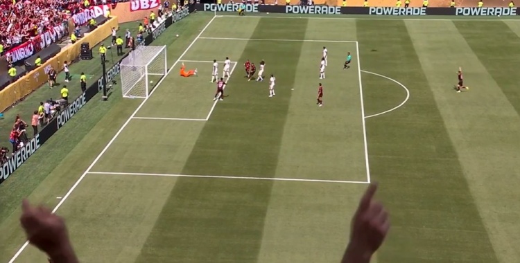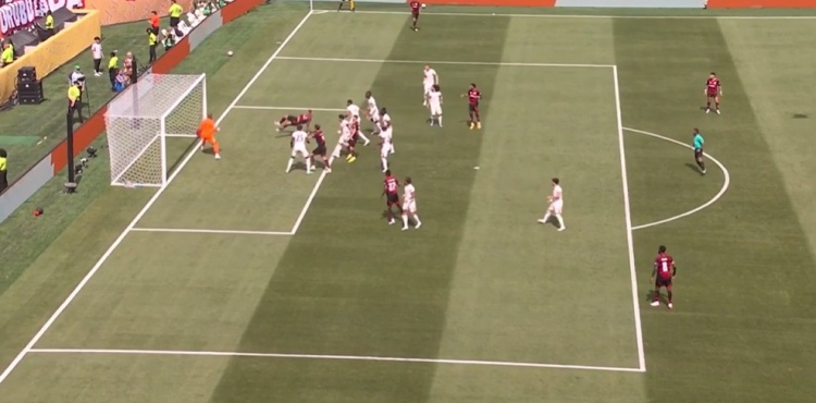 第65分钟,弗拉门戈右路角球开到禁区,后点恩里克头球摆渡回门前,达尼洛跟进凌空垫射入网,弗拉门戈3分钟2球反超比分↓