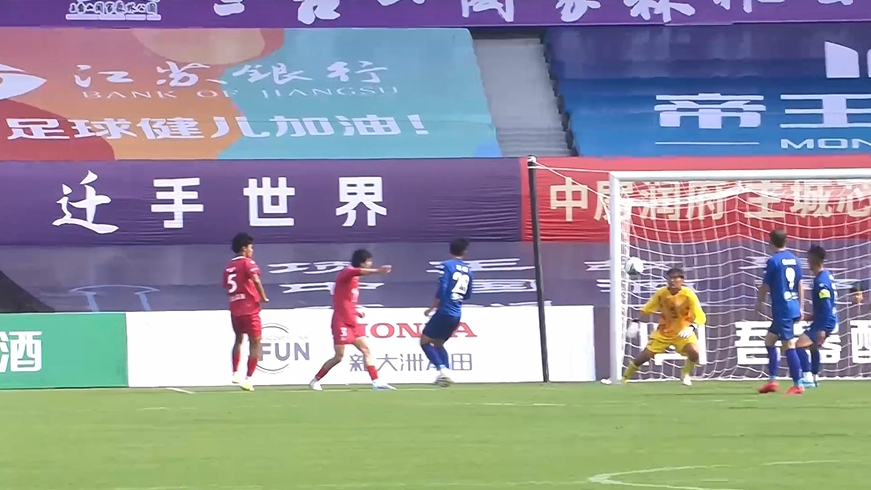 上半场第19分钟,盐城队3号唐锦头球破门,盐城1-0领先!