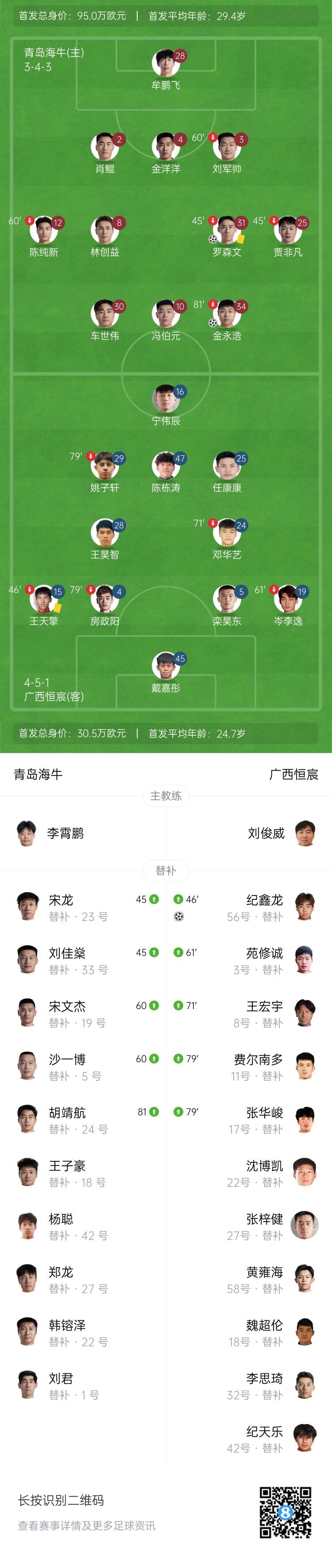 伤停补时6分钟。全场比赛结束,青岛海牛2-1广西恒宸。