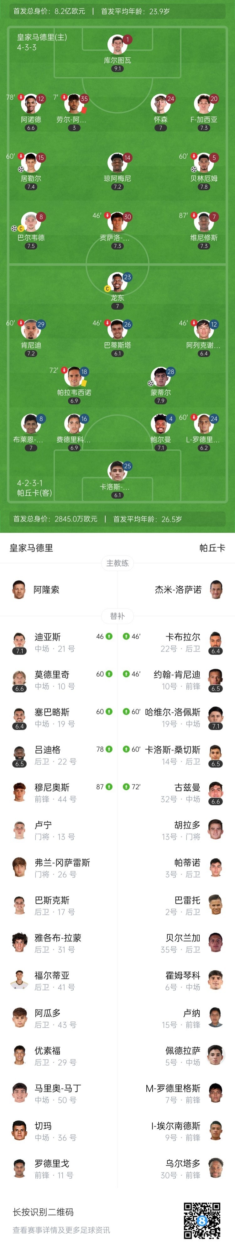 下半场补时5分钟。最终全场比赛结束,皇马3-1帕丘卡。