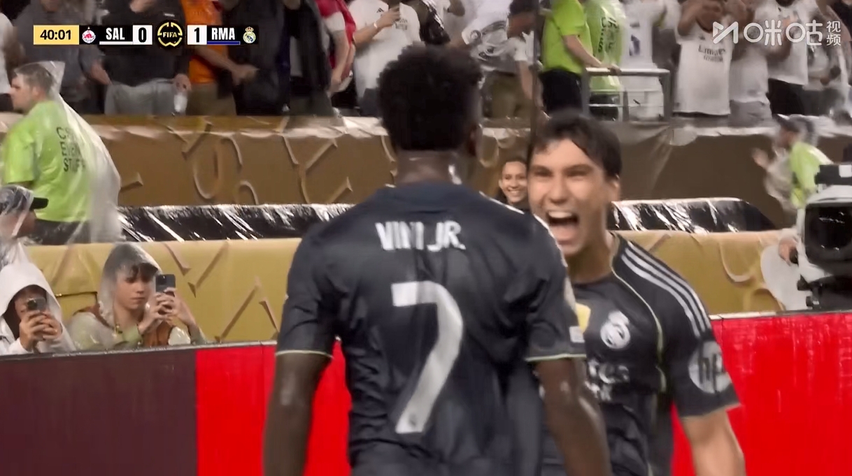第40分钟,皇马打出一次反击,贝林厄姆中场送出直塞,维尼修斯得球后突破到禁区弧顶起脚低射破门,皇马1-0领先!↓