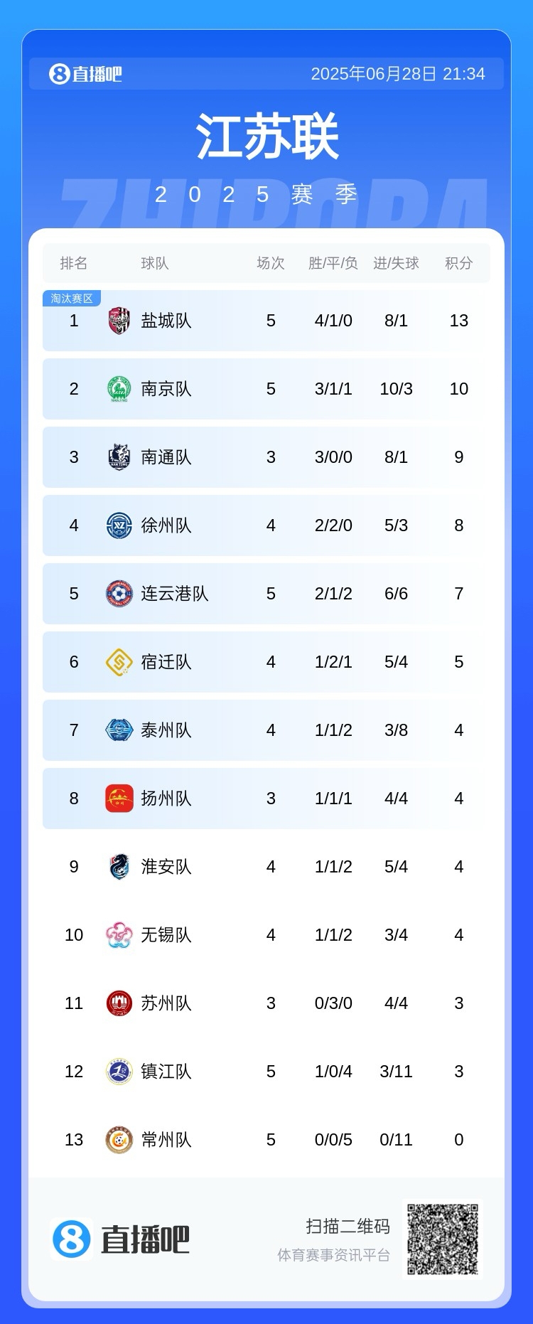 “苏超”最新积分榜