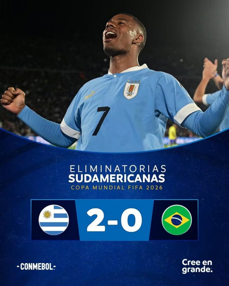 10月18日讯 北京时间10月18日上午8:00,世预赛南美区第4轮,巴西对阵乌拉圭。上半场,努涅斯头球建功,内马尔伤退。下半场,罗德里戈任意球中楣,努涅斯助攻德拉克鲁斯破门。全场结束,巴西0-2乌拉圭。此战过后,两队同为2胜1平1负积7分,乌拉圭暂列第2,巴西下滑至第3。
